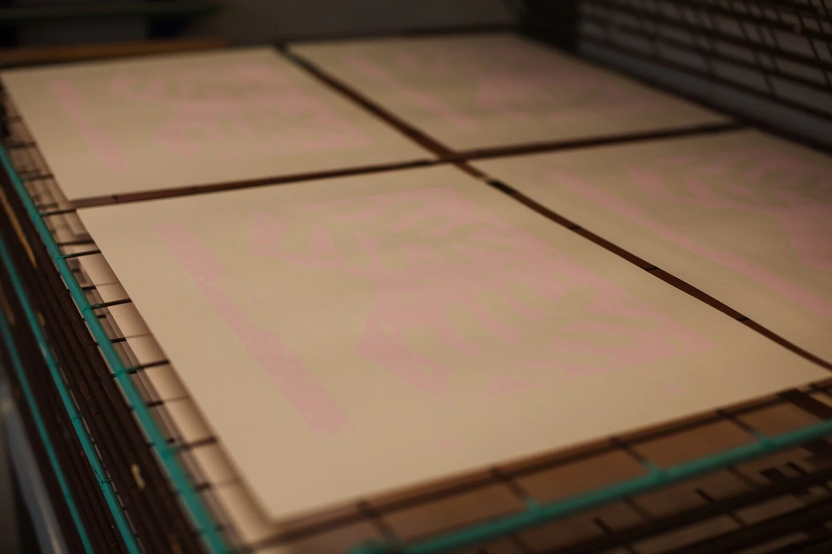 In between preparing for my upcoming March show, making 99 ceramic rings and trying to stay awake during the dark scandinavian november afternoons I did have time to visit my friends Rune and Rune’s silkscreen studio. After working out there during the summer I got excited about doing more. It’s a lot of fun. This time I opted to do the image in gouache so I could work in my current element which is with brushes. The last one I did with pencils. Maybe its for nerds but the outlines gets different using a brush. Second step was driving everyone crazy finding the exact red, the exact pink, the specific indigo blue that has become my preferred blue and then of course something that gets close to the chrome oxide green that has been the color of many of my leaves since Under Distant Palmtrees. I added lots of process shots further down this blogpost.